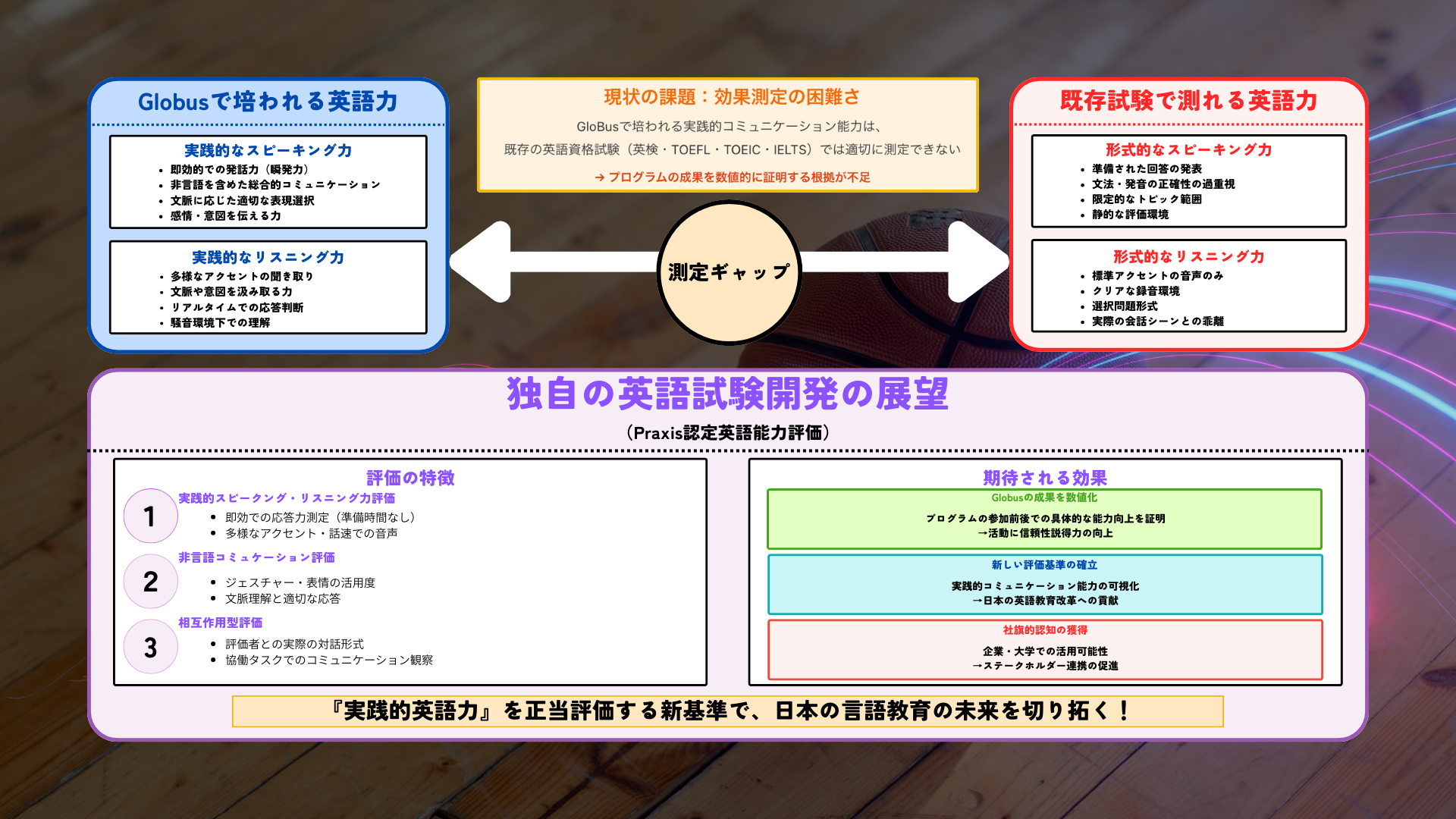 インターナショナルスクール生と日本人学生をバスケットボールで接続するイベントを継続的に開催し、スポーツという身体性を伴う体験の中で実践的な英語力を育む場を提供する。同時に、スピーキングやリスニングといった実用的なコミュニケーション能力を測る新たな語学力試験の開発に挑む。従来の試験が測れなかった瞬発的な応答力、非言語要素の活用、協働的な対話力を評価する独自の指標を構築することで、英語学習の目的そのものを再定義する。