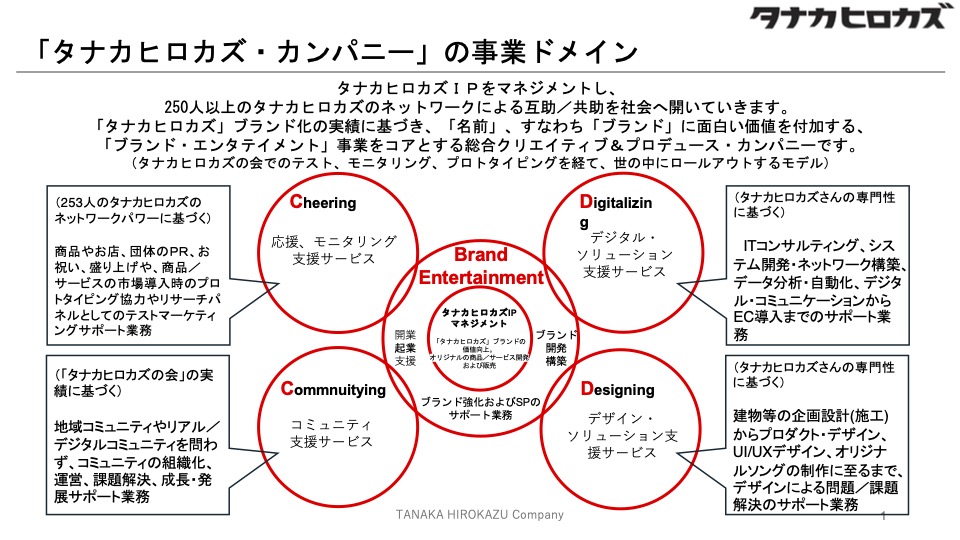 1994年からはじまる同姓同名でつながる社会実験「タナカヒロカズ運動」から生まれた、250人以上のタナカヒロカズの個性/専門性/プロフェッショナルスキルの集合体として、タナカヒロカズたちで築く互助、共助のコミュニティのパワーを、広く社会に向けて開き、提供していきます。「タナカヒロカズ」ブランド化の実績に基づき、「名前」、すなわち「ブランド」に面白い価値を付加する、「ブランド・エンタテイメント」事業をコアとする総合クリエイティブ&プロデュース・カンパニーです。