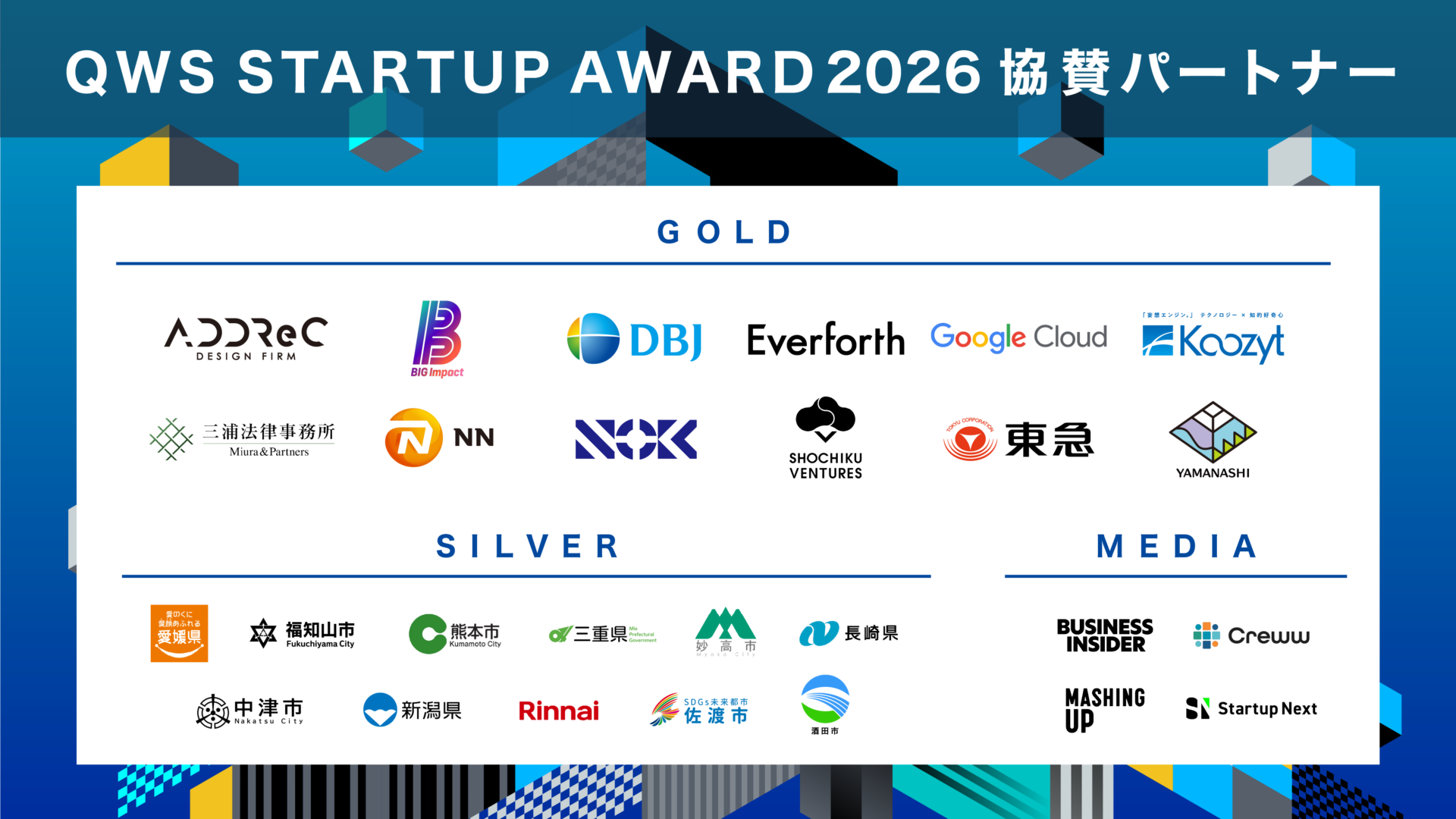 QWS STARTUP AWARD 2025 に、協賛パートナーとして以下の企業、自治体の皆様が参画され、賞品や事業共創機会の提供をいただきます。審査を務めるエンジェル投資家やベンチャーキャピタリストに加え、企業、自治体と多様なステークホルダーが一体となってスタートアップを応援していきます。